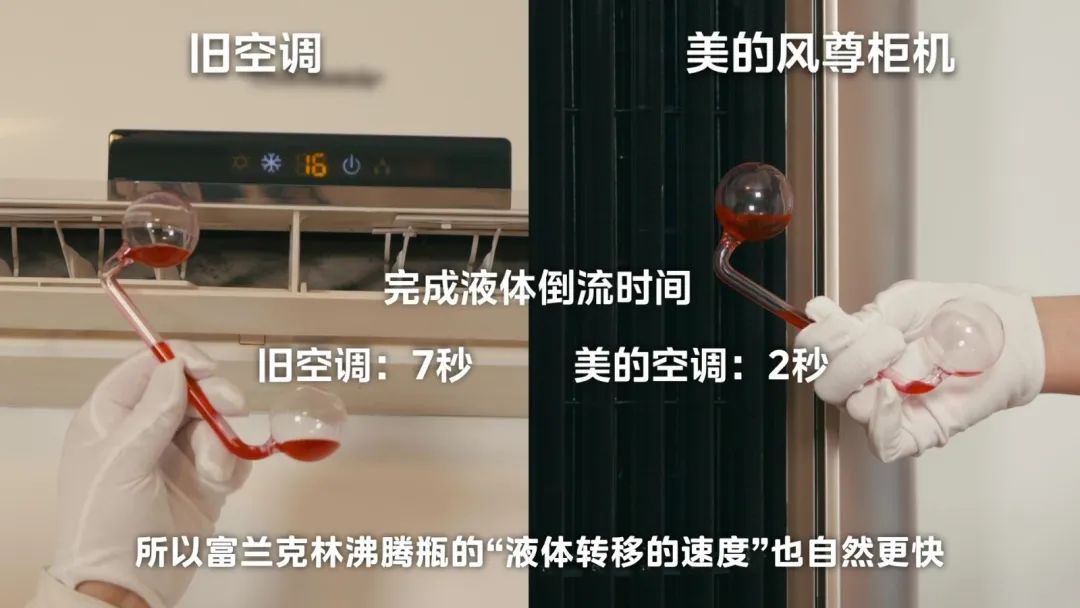 通过测试,我们可以看到美的风尊柜机空调出风口处的球体温度下降速度更快,所以富兰克林沸腾瓶"液体转移的速度"相对于老空调自然也更快。
