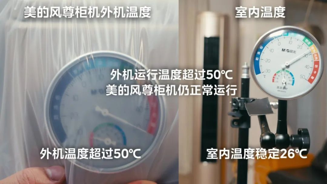 在测试时,我们通过用塑料布阻止外机散热,提升外机运行温度。可以看到外机运行环境温度超过50℃,美的风尊柜机空调依然没有停机正常运行,而室内温度也没有降低,稳定在26℃。