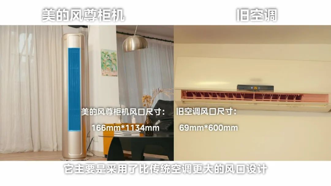 原因也很简单:首先,美的风尊柜机空调拥有7290W额定制冷量,远大于旧空调3500W额定制冷量,更适合大客厅。