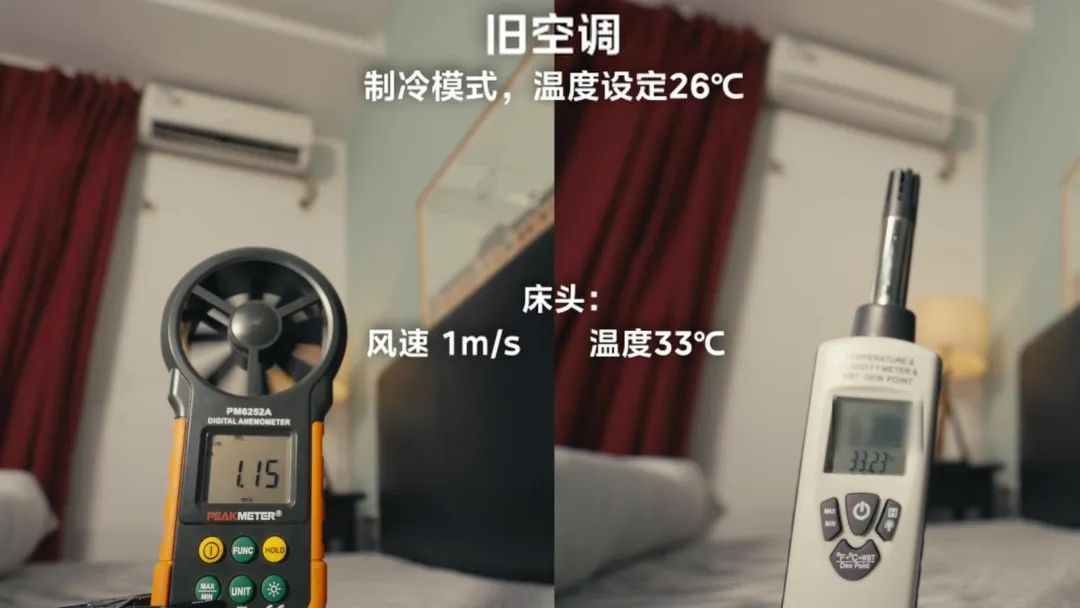 我们可以看到旧空调采用的都是传统简单的导风板,只能90°转动,送风面积有限,冷风直吹人,制冷效果也打折扣,影响体感。为此,我们在床头对旧空调的风速和温度进行了实测,发现风速竟然高达1m/s,确实有明显的冷风直吹现象。