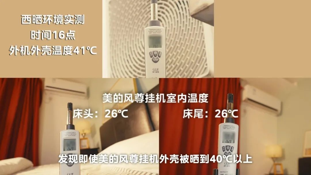 通过测试,我们可以看到即便是美的风尊挂机空调外机面对高温暴晒,内机运行依然不受影响,正常制冷,蒋女士孩子床头床尾的温度非常稳定,这同样是因为美的风尊挂机旗舰版空调也搭载了国际专利冷媒环技术,超级抗热,即使是面对高温暴晒,也能稳定运行。
