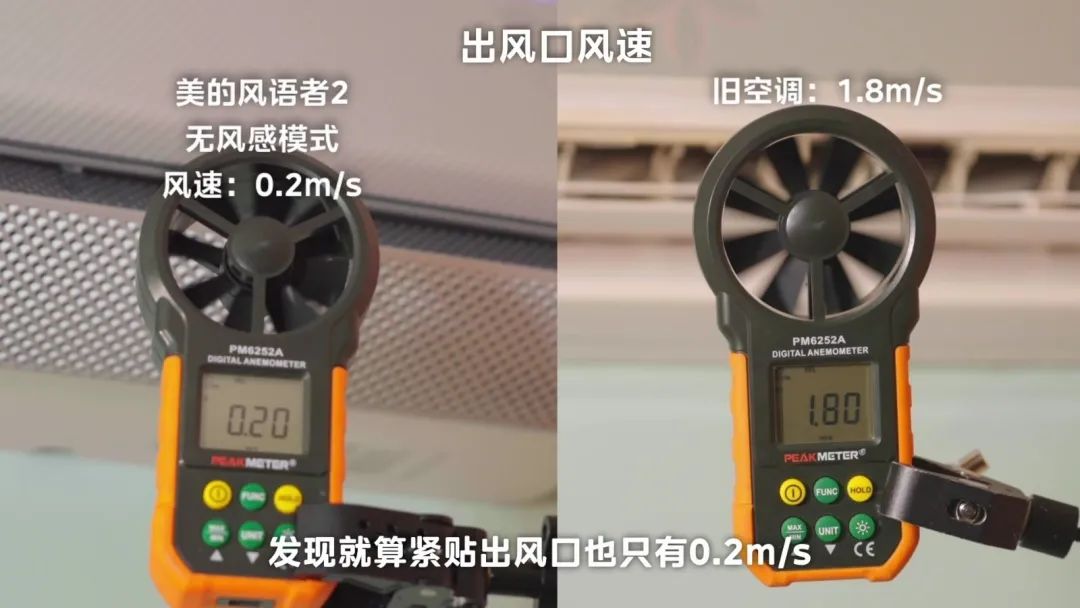 为了验证它真的是冷风不吹人,我们首先实测了美的风语者Ⅱ挂机空调开启无风感模式后出风口的风速。