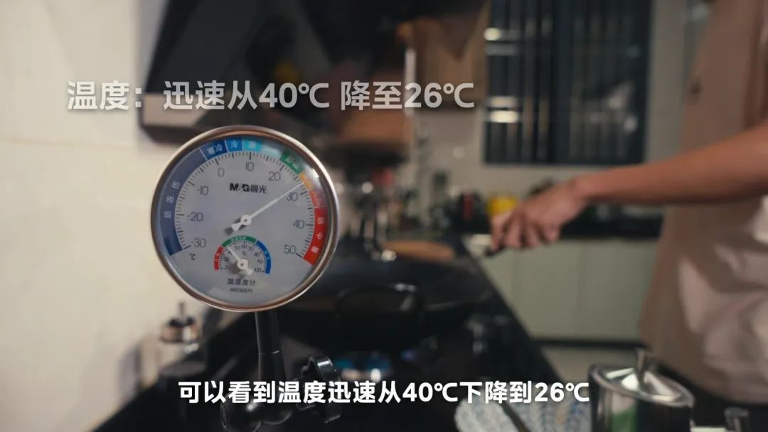 我们在下厨中的厨房内,开启美的吸顶式厨房空调,可以看到随着空调开启温度迅速从40℃ 下降至 26℃ ,且下厨全程基本可以维持在这个温度,难怪魏先生都称赞一开启空调瞬间就感觉凉快了不少,一个灶煲汤,一个灶炒菜也不会觉得热。